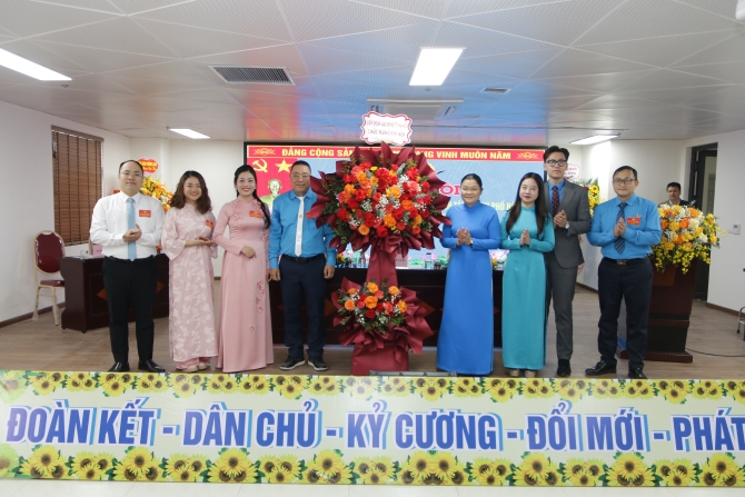 Các đồng chí trong Ban Giám đốc Trung tâm tặng hoa chúc mừng Ban Chấp hành Công đoàn, nhiệm kỳ 2025 - 2030 ra mắt Đại hội.