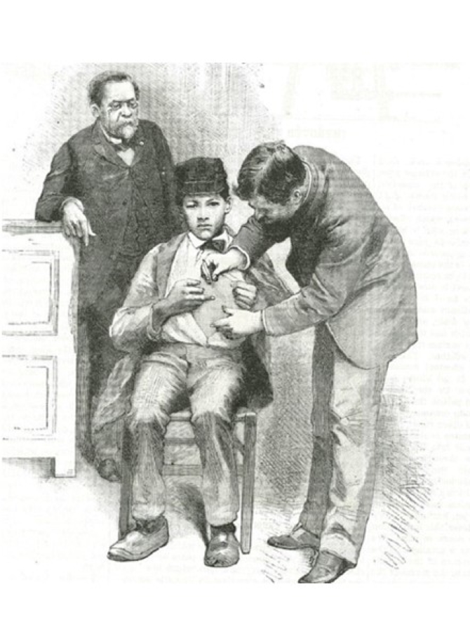 Bác học Louis Pasteur và Bác sĩ Grancher tiêm vắc xin dại cho bệnh nhân đầu tiên (nguồn từ WHO).