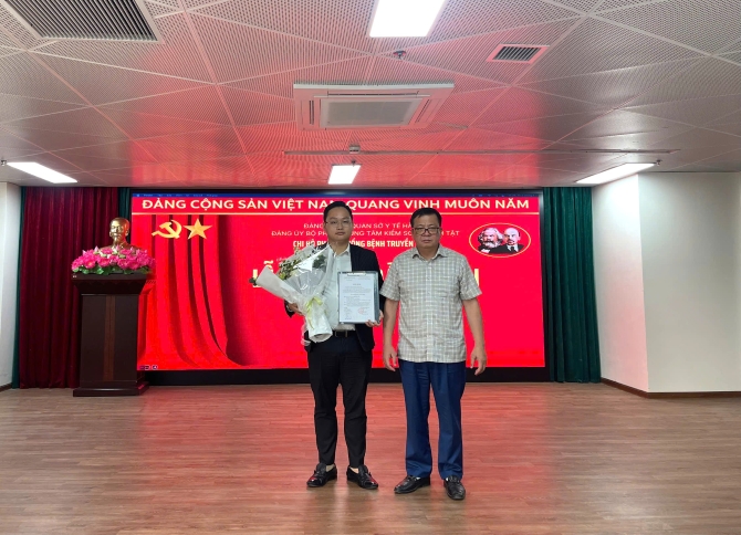 Đồng chí Bùi Văn Hào - Bí thư Đảng bộ bộ phận, Giám đốc Trung tâm Kiểm soát bệnh tật thành phố Hà Nội trao Quyết định kết nạp Đảng cho đồng chí Hoàng Ngọc Sơn.
