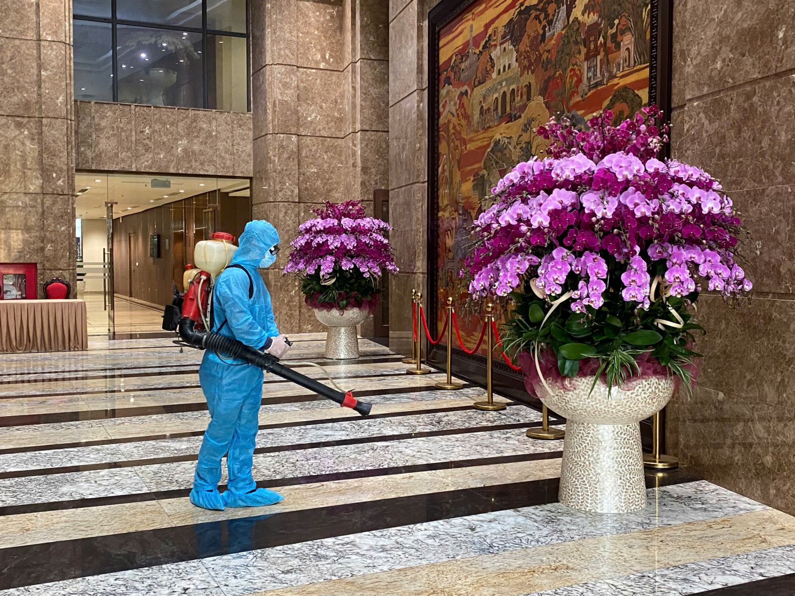 Sảnh toà nhà, các bề mặt có nguy cơ tiếp xúc cao… cũng được khử khuẩn, vệ sinh nhằm kiểm soát tối đa dịch bệnh.