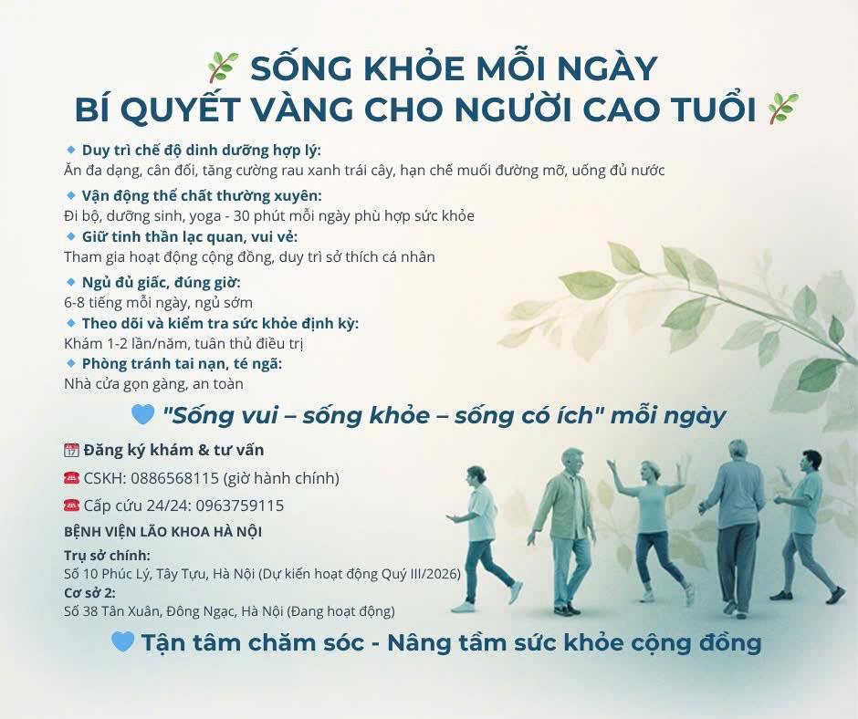 Các bác sĩ Bệnh viện Lão khoa Hà Nội nhấn mạnh, chăm sóc sức khỏe người cao tuổi không chỉ là trách nhiệm của bản thân mỗi người mà còn cần sự quan tâm, đồng hành của gia đình và cộng đồng. Việc xây dựng lối sống lành mạnh ngay từ hôm nay sẽ giúp người cao tuổi sống vui, sống khỏe và tiếp tục phát huy vai trò của mình trong gia đình cũng như xã hội.
